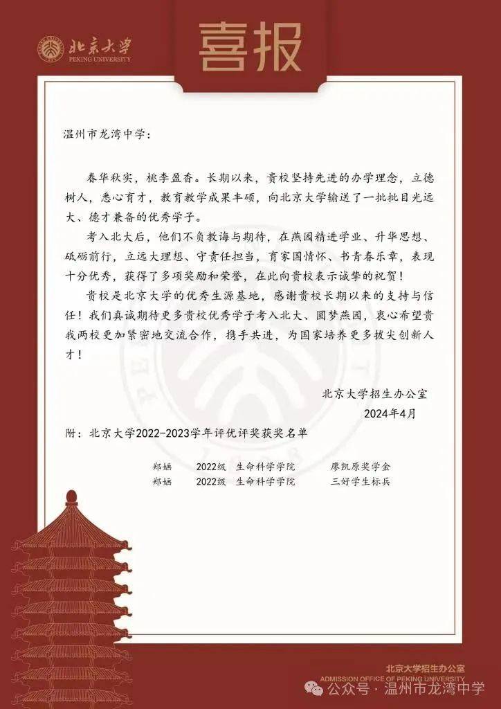 近日,北京大学向龙湾中学发来喜报,祝贺 我校毕业生郑婳获得2022—2023学年廖凯原奖学金和三好学生标兵,同时也对龙湾中学丰硕的教育教学成果给予赞扬。