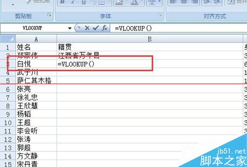 6、现在我们已经输入好一个公式了。接下来的所有人的籍贯也就简单多了。只要把鼠标放在刚刚那个输入好的公式文本框右下角,鼠标变成黑十字架,双击鼠标左键。这样下面所有人的籍贯就都出来了