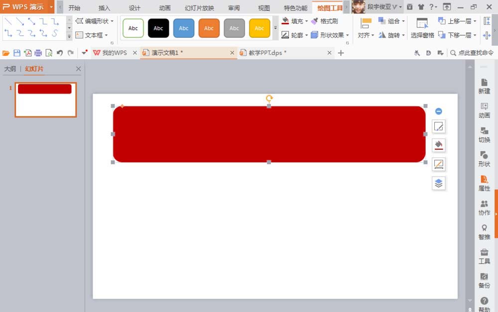 2、选择插入选项,选择圆角矩形工具,绘制图形,按下鼠标右键,自动为图形 填充深红色。将图像的轮廓颜色设置为无轮廓,如图
