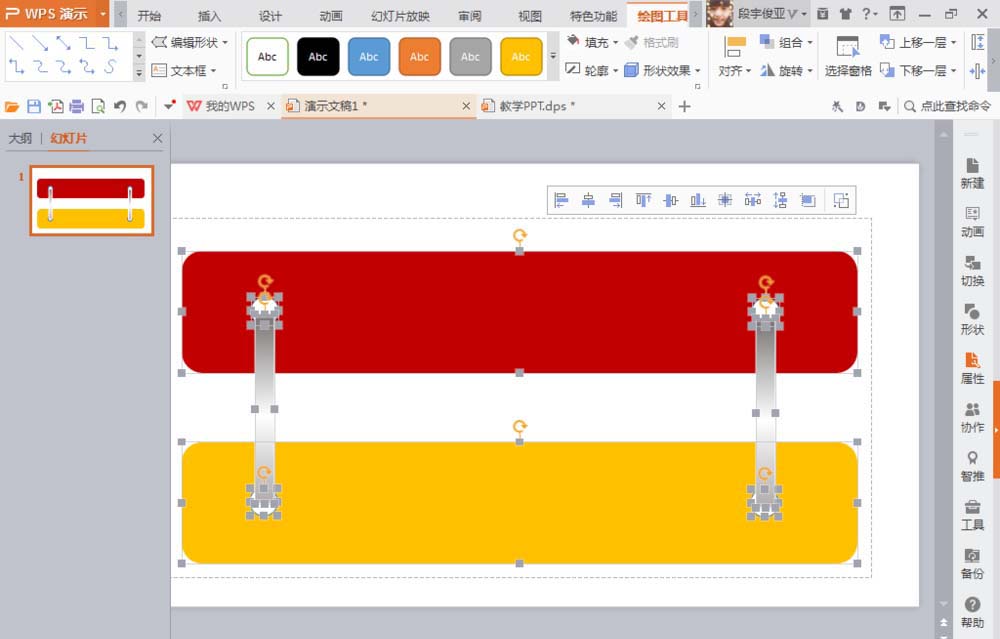 5、自动更改4个圆形颜色为白色,再次选择圆角矩形工具,绘制圆角矩形,鼠标右键打开对象属性对话框,选择渐变颜色填充,渐变类型为线性渐变,颜色从左到右的方面为灰色,白色,灰色颜色的渐变。如图,按下ctrl键再次复制一个圆角矩形,调整到红色和黄色圆角矩形的两边。