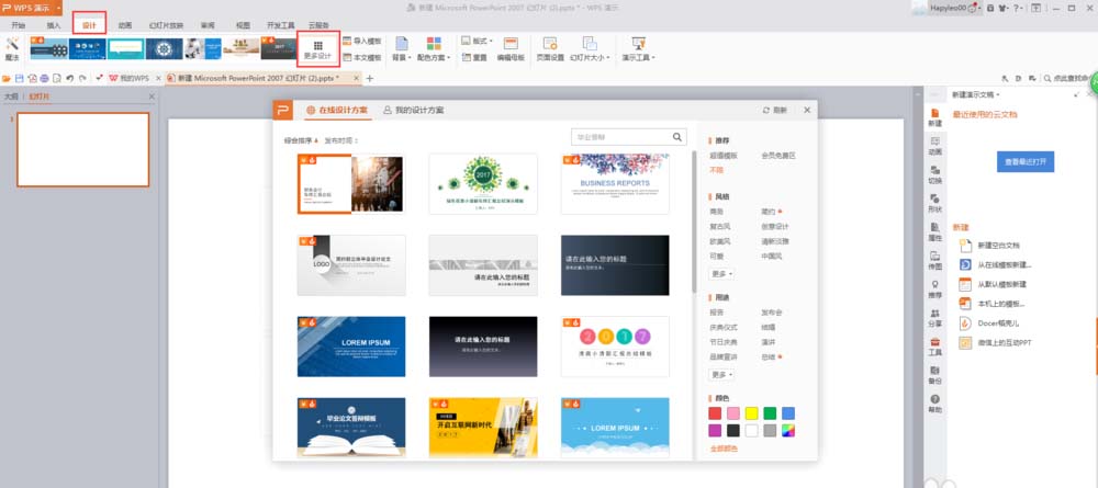 2、点击菜单栏“设计/更多设计”,弹出在线设计方案;
