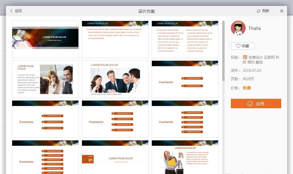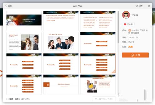 3、点击其中一个模板即可预览整套模板,如果喜欢此模板可先点爱心符号“收藏”,再点击“应用”,弹出下载提示框,下载完成后,模板直接插入到当前的页面中。