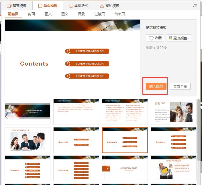 5、点击喜欢的模板页,点击“插入此页”,即可成功添加新的模版幻灯片页;
