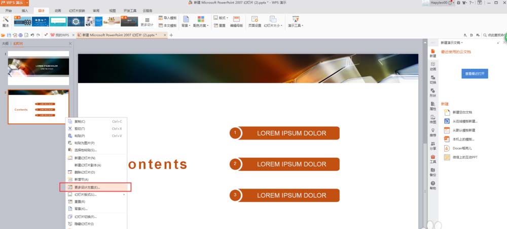 6、如果不喜欢当前的模板样式可以在当前页点击右键,选择“更多设计方案”,在【我的设计方案】里可看到刚才收藏的模版,选择浏览整套模版,选择想要的单页模板即可。