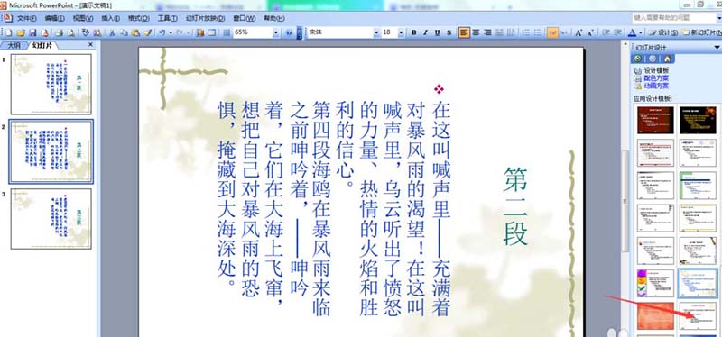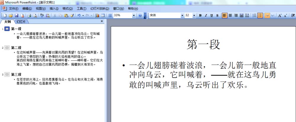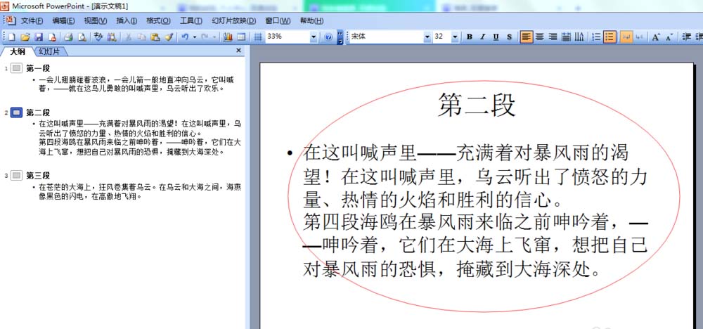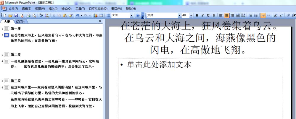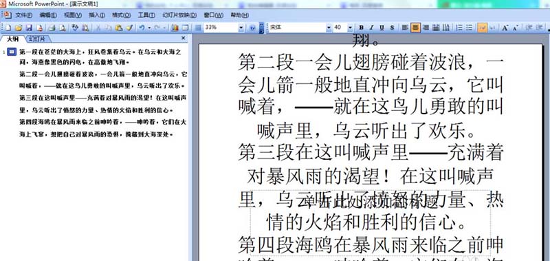 2、把要编辑的文字复制到PPT,这里选取的是《海燕》的课文,可以看到非常的乱