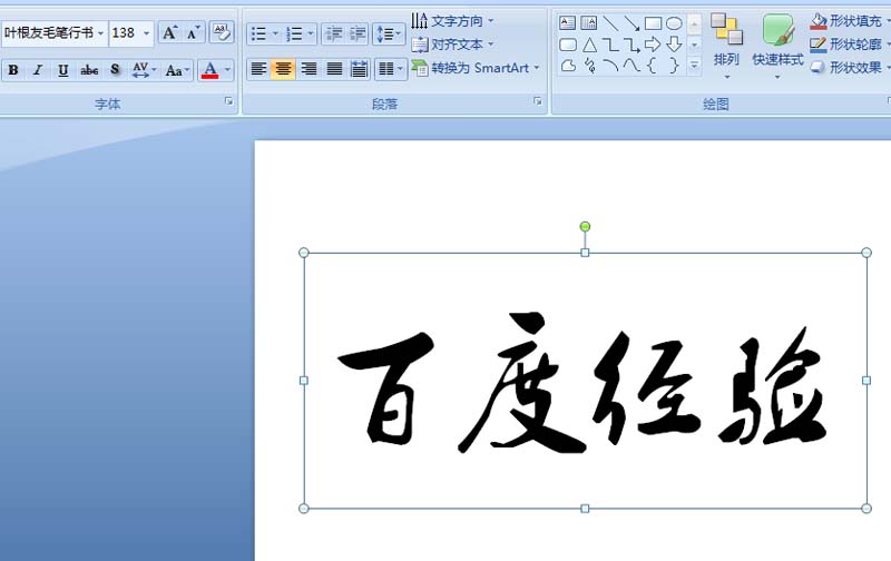 1、首先启动ppt2007,新建一个文档,执行插入-文本框命令,输入内容为“百度经验”设置文字大小为138,字体为叶根友毛笔行书。
