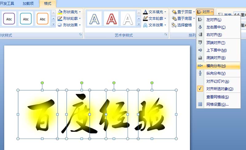 4、按住shift键依次选择四个正圆进行全部选中,执行格式-对齐-横向分布命令,将所有的正圆进行排列整齐。
