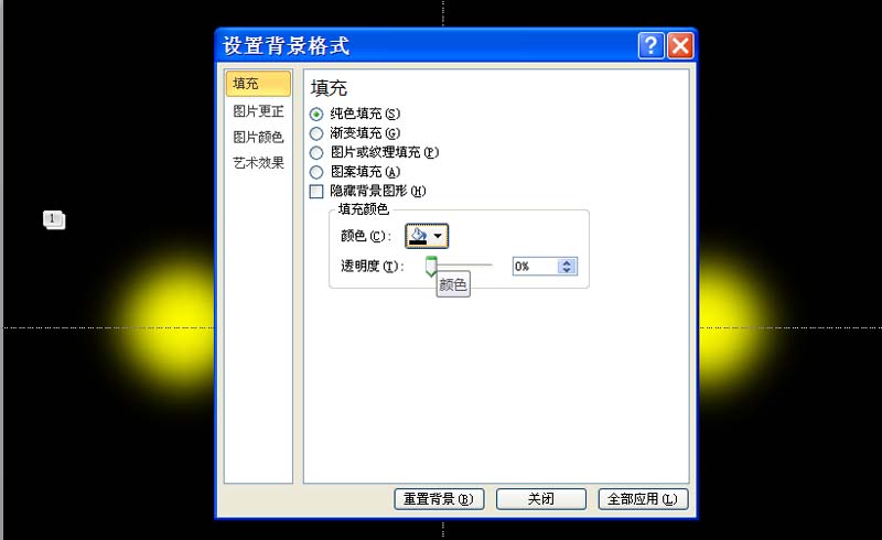 9、播放动画查看效果,右键单击幻灯片从下拉菜单中选择设置背景格式选项,在弹出的对话框中设置填充为纯色填充,并设置为黑色。