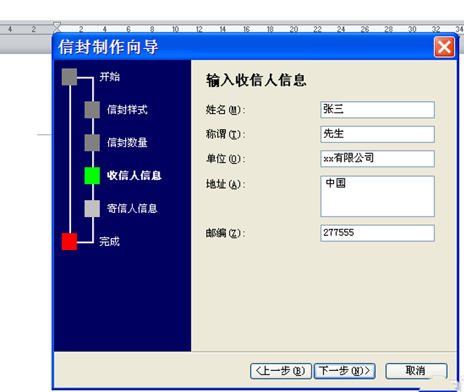 6、接着输入寄信人相关信息,点击下一步按钮,接着点击完成按钮,这样就完成的信封的制作。