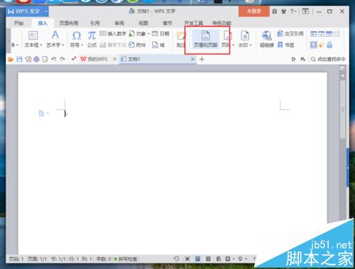 2、在打开的Wps文字程序窗口,打开插入菜单选项卡,点击“页眉和页脚”选项按钮。如图所示;