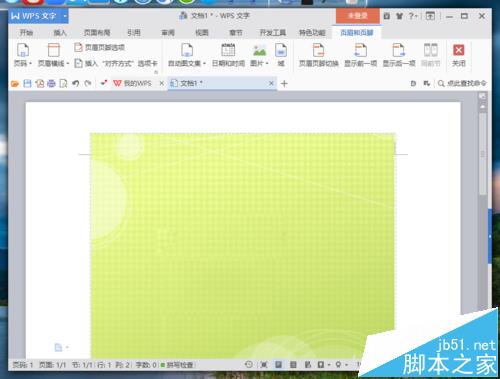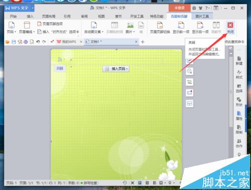 11、图片铺满后,点击页面和页脚的“关闭”按钮。退出页面和页脚的编辑。如图所示;