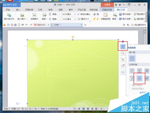 8、接下来,要将图片设置铺满这个页面。选中图片,点击布局选项按,在弹出的布局选项中,选择“衬于文字底部”选项并点击它。如图所示;