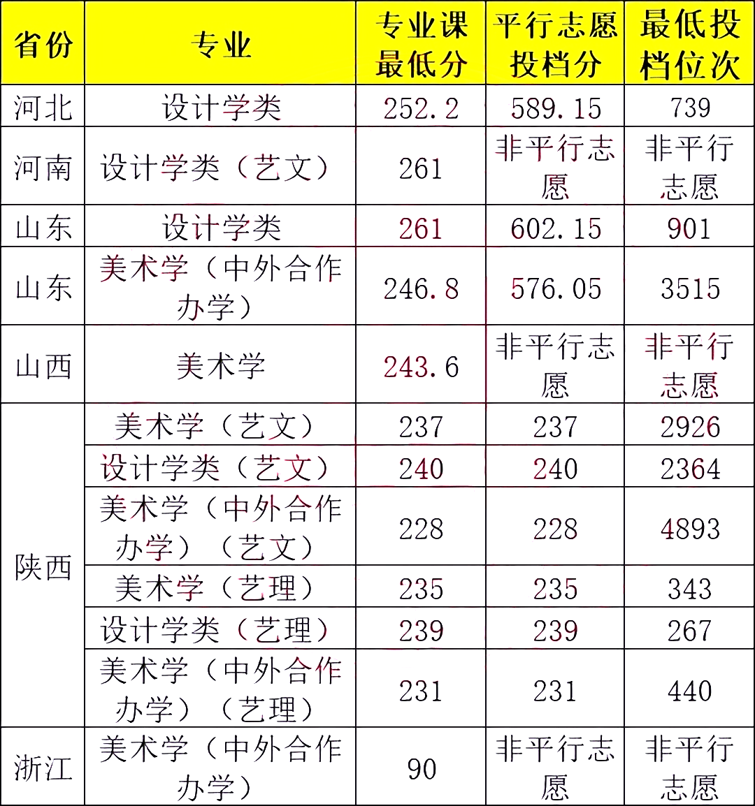 备注:由于2024年各省美术联考满分均统一为300分,且多数省份平行志愿投档分计算公式改变,所以往年录取分数参考价值变小,建议考生参考录取位次。