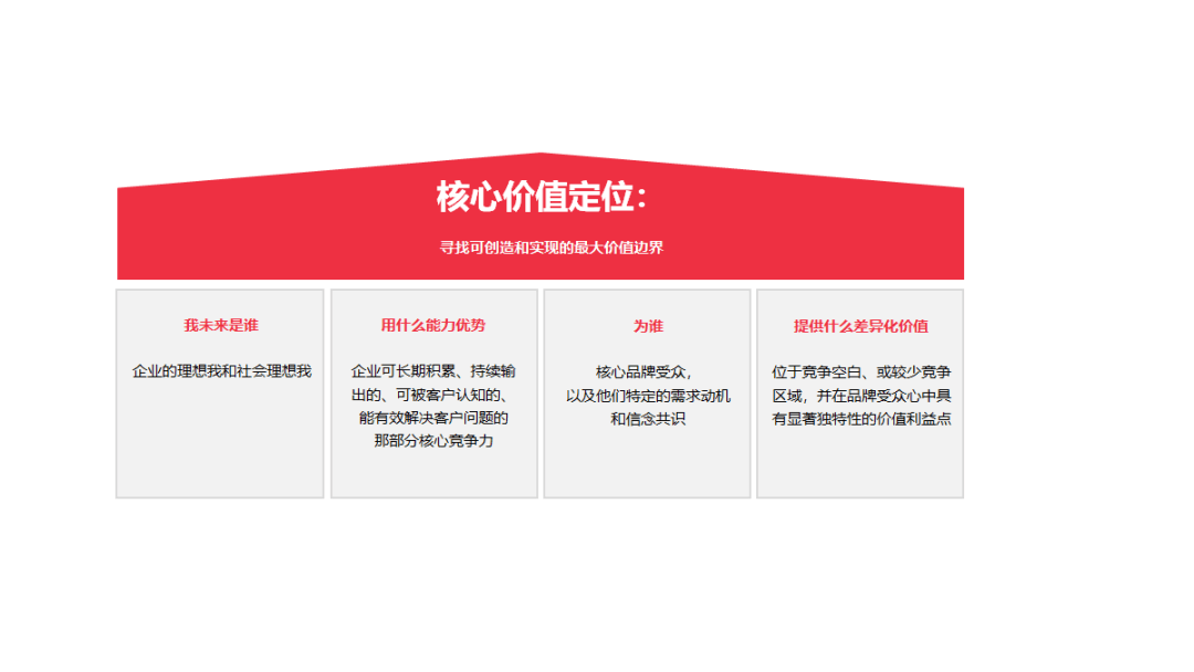 简而言之,核心价值就是我们未来希望成为谁,通过哪些能力优势,为谁,提供何种差异化的价值。