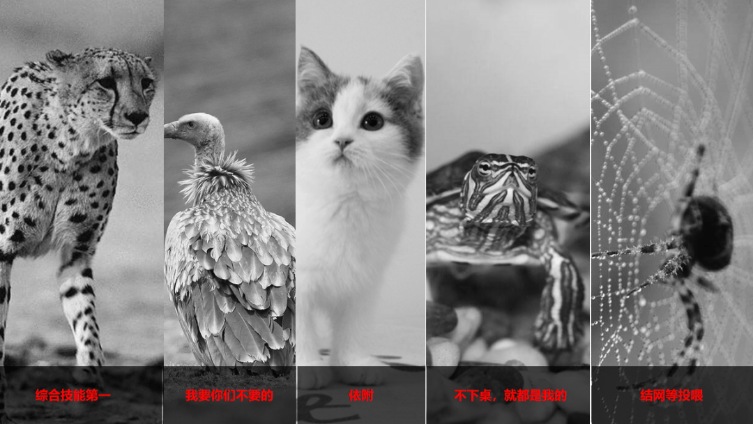 乌龟则以慢稳著称,用最少的能量换取长期生存,展现了大智若愚的智慧。而蜘蛛则通过织网守株待兔,等待猎物自投罗网,这类似于那些铺开价值网络等待商业机会的商业模式。