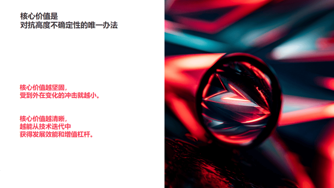 去年在北大国发院MBA的一次关于数字化时代下的职业发展主题论坛上,我也分享过这样的观点:一个人的核心价值越稳固,他受到外在变化的冲击就越小;核心价值越清晰,他就越能从技术的迭代中,获得发展效能和增值杠杆。